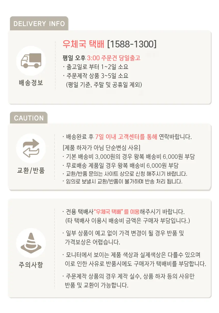 - 고객센터 연락없이 물건을 보내시어 분실될 경우, 교환/환불이 어려울 수 있습니다. 또한 타 택배사 이용시 배송비가 추가로 더 나올 수 있습니다.